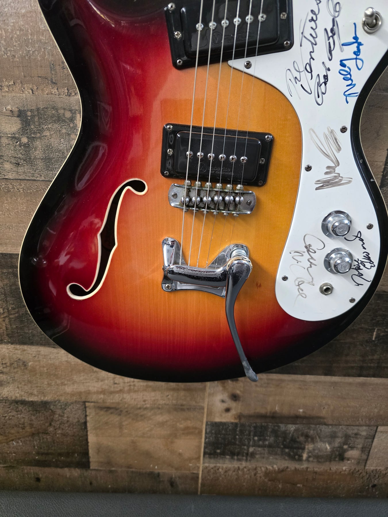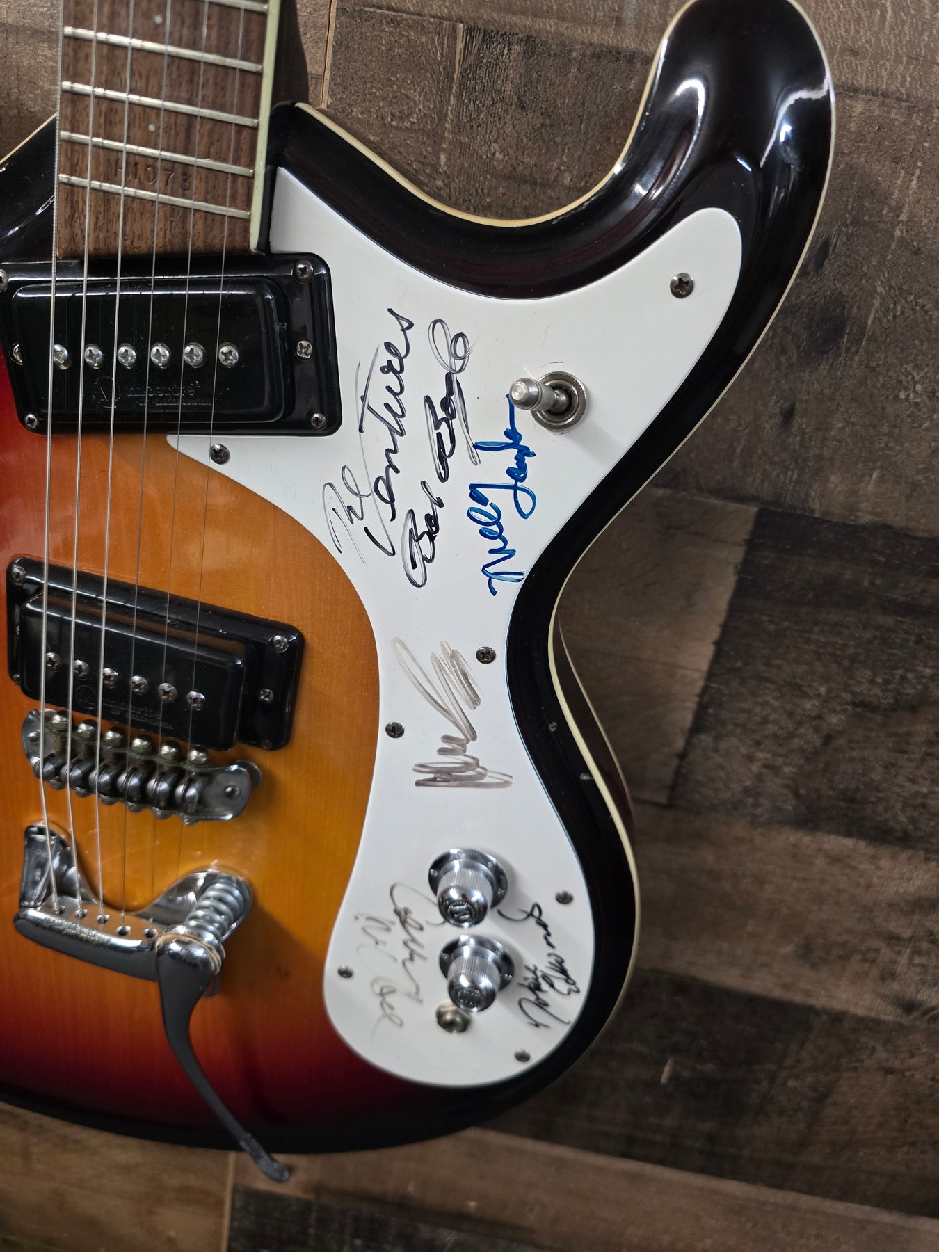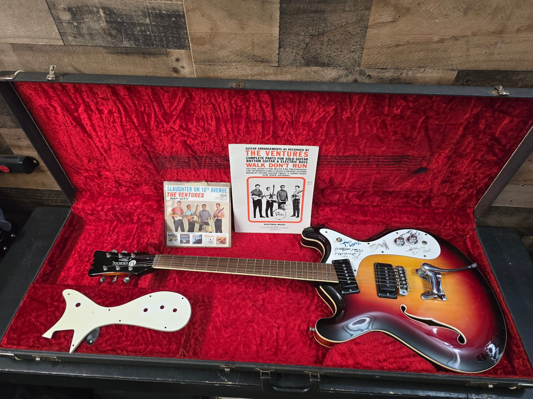 1960s Mosrite COMBO Signed By The Ventures W/Ohsc. This guitar is in great condition for the age. Very little playwear over the years. Maybe a couple of light scratches here and there. Nothing major. The pick card has been signed by the ventures. But we are including a second pet guard with the guitar that is not signed. Very cool guitar. Everything works as it should 100% original.