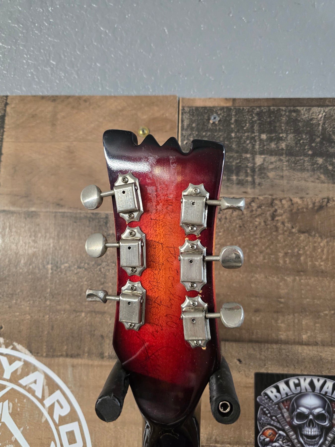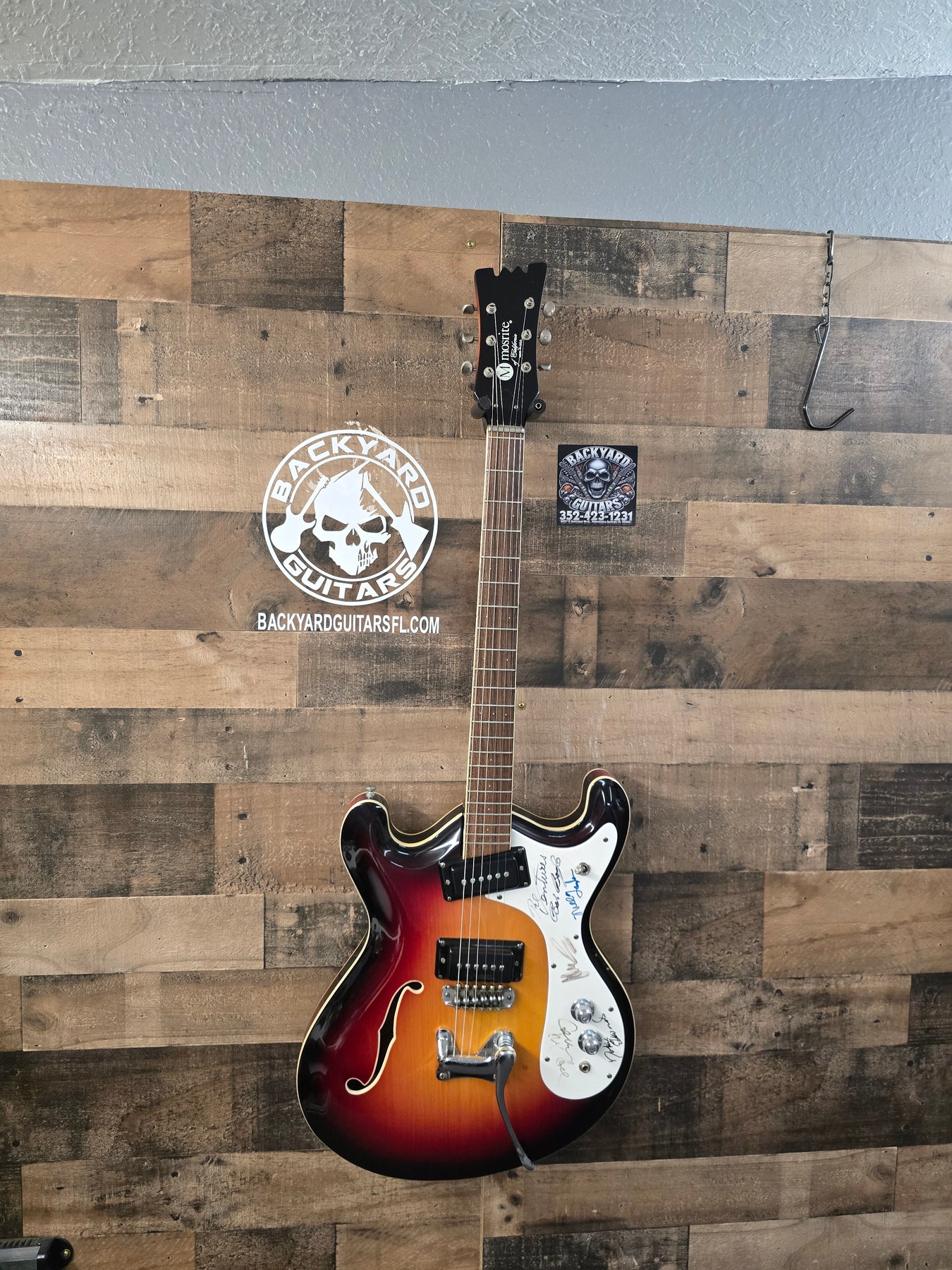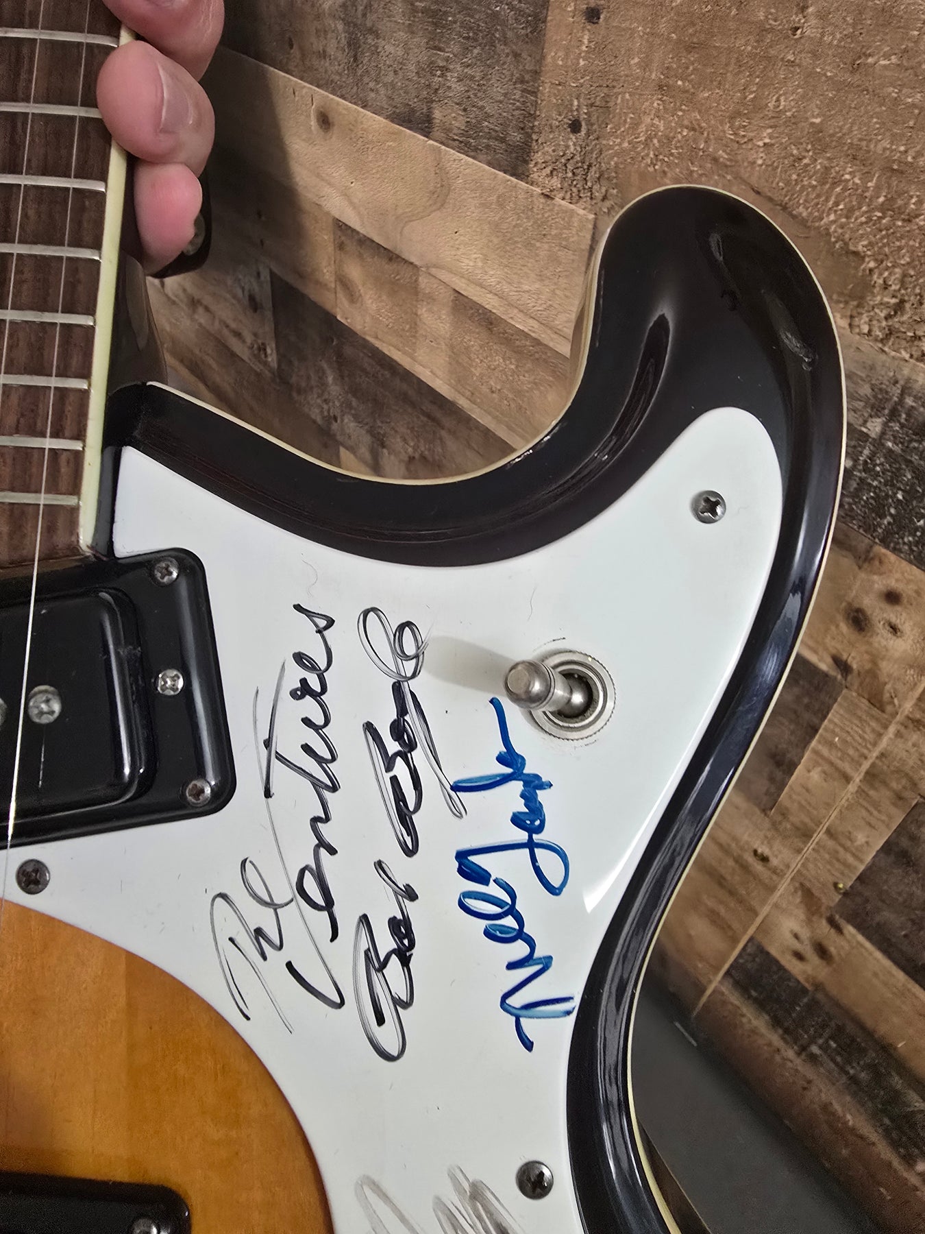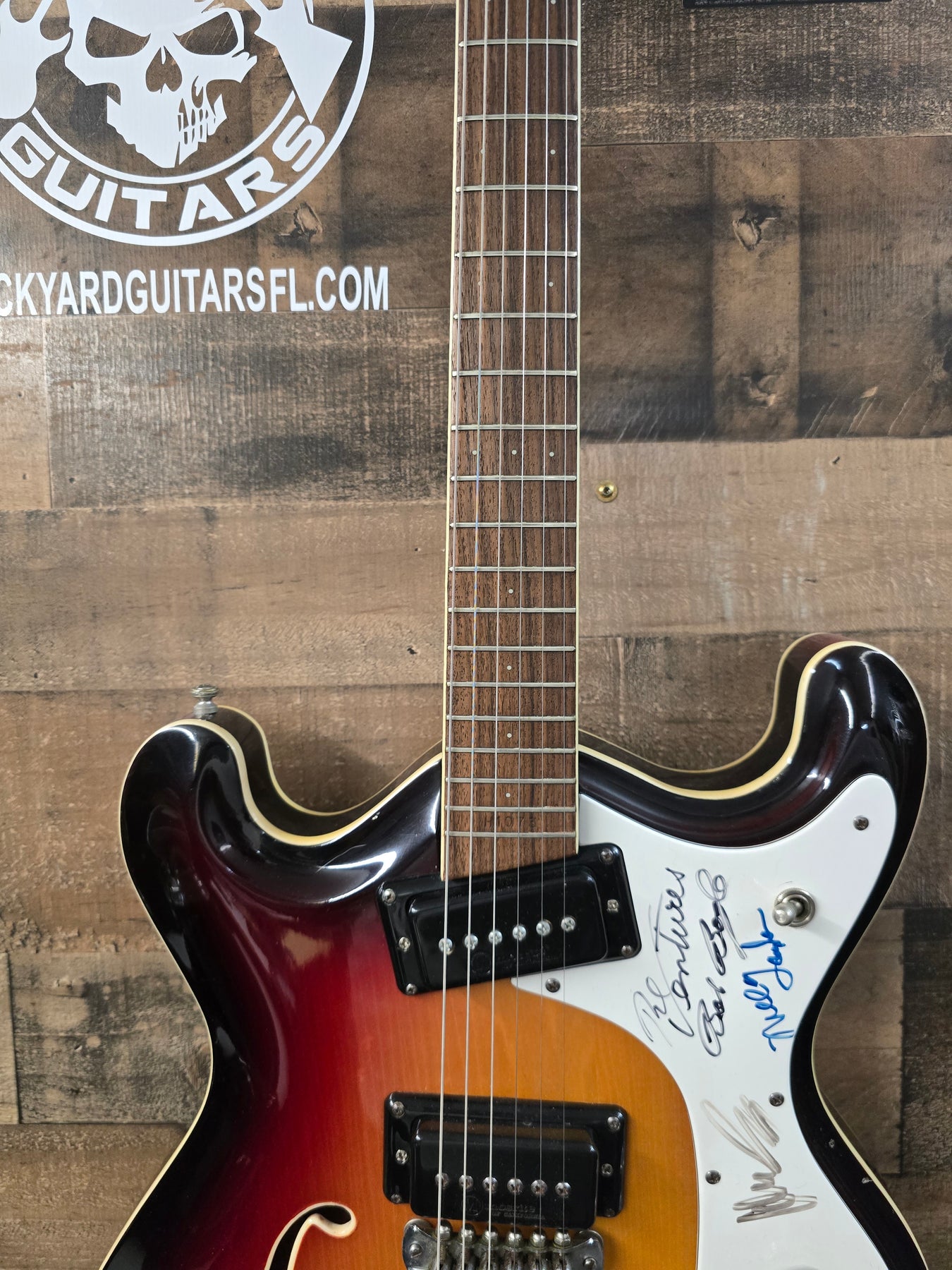1960s Mosrite COMBO Signed By The Ventures W/Ohsc. This guitar is in great condition for the age. Very little playwear over the years. Maybe a couple of light scratches here and there. Nothing major. The pick card has been signed by the ventures. But we are including a second pet guard with the guitar that is not signed. Very cool guitar. Everything works as it should 100% original.